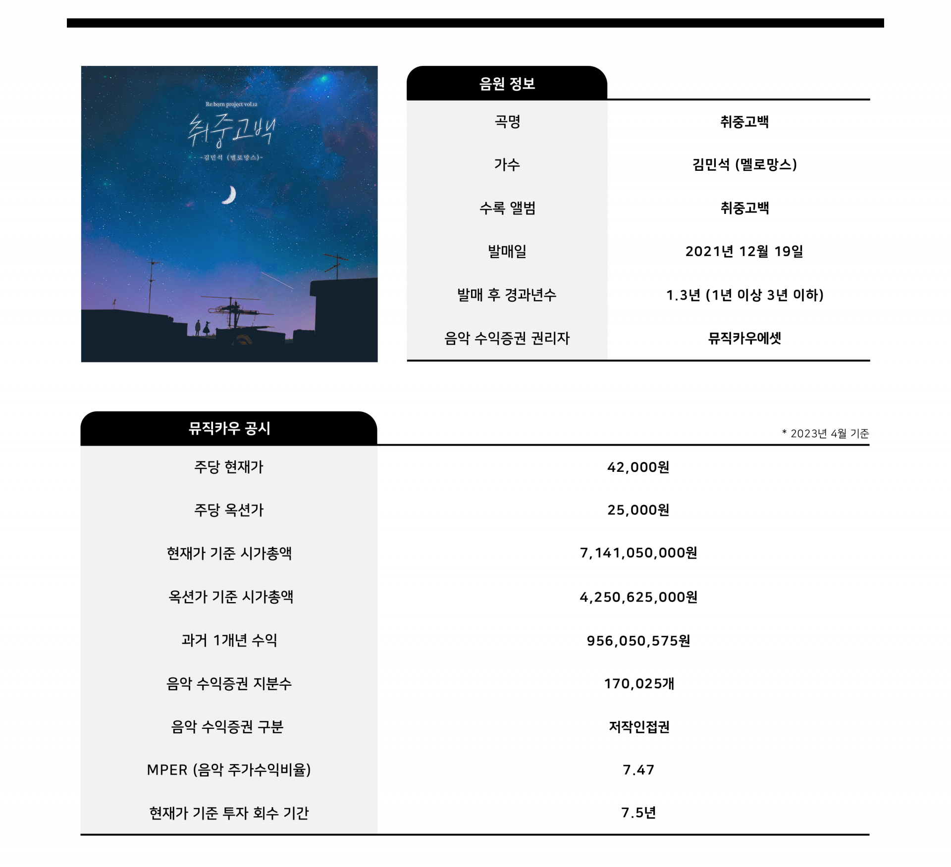 그럼, 매혹적인 음색의 소유자, 김민석님의 '취중고백' 곡의 음악 수익증권의 정보를 뮤직카우에 공시된 정보와 함께 확인해 보도록 하겠습니다.